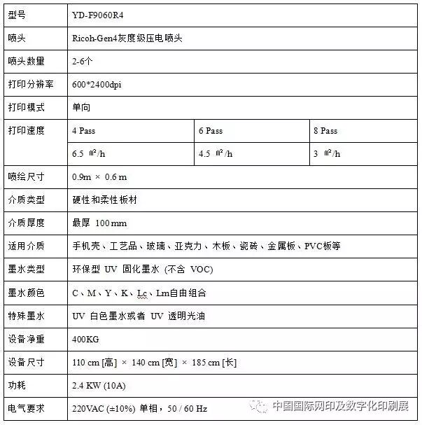 YD-F9060R4UV平板打印機采用2-6個灰度級理光(Ricoh)全不銹鋼內加溫工藝微壓電噴頭,點火頻率30HKz,可變墨滴灰度級打印,最小7pl最大35pl,容易打印600*2400dpi分辨率的高清圖像。打印尺寸0.9m (長) × 0.6m (寬) ×0.1m(高),適用介質:手機殼、工藝品、玻璃、亞克力、木板、瓷磚、金屬板、PVC板等。
