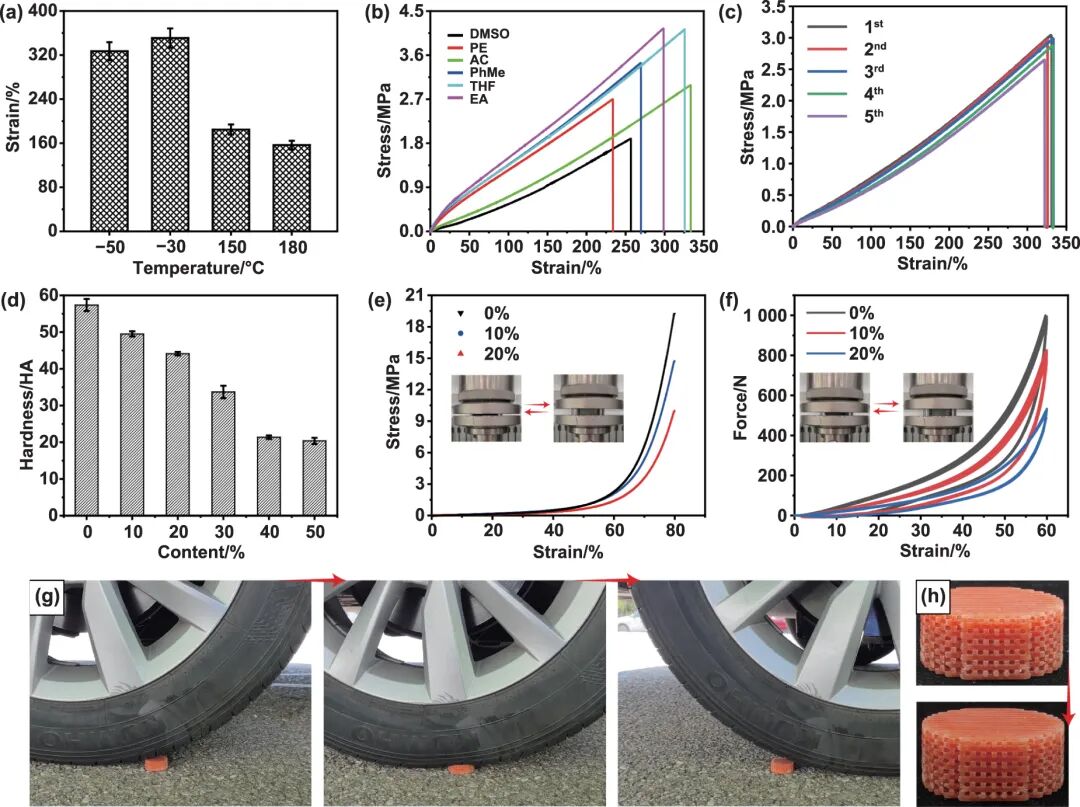 研發的SR彈性體在各樣要求下表現出卓越的穩定性,包含高溫和低溫、暴露于各樣有機溶劑和高壓縮性。如圖 3(a) 所示,盡管拉伸應變在150 °C和180 °C時明顯降低,但彈性體的性能仍然與傳統SR相當。為了評定化學穩定性,將 SR-20 彈性體在六種區別的溶劑中浸泡24小時,結果顯示,浸泡后,SR-20彈性體保持其拉伸應力,并在EA和THF中表現出超過300%的應變24 h,顯示強度和柔韌性保持不變。最后,對相同的圓柱形SR-20彈性體試樣進行了汽車壓縮實驗,壓縮的SR-20彈性體恢復后沒有斷裂或不可逆的變形(圖 3(g)和(h))。總體而言,所制備的 SR 彈性體表現出出色的拉伸性、可壓縮性、化學穩定性以及耐高低溫性,在各樣極端要求下表示出各樣應用的巨大潛能。