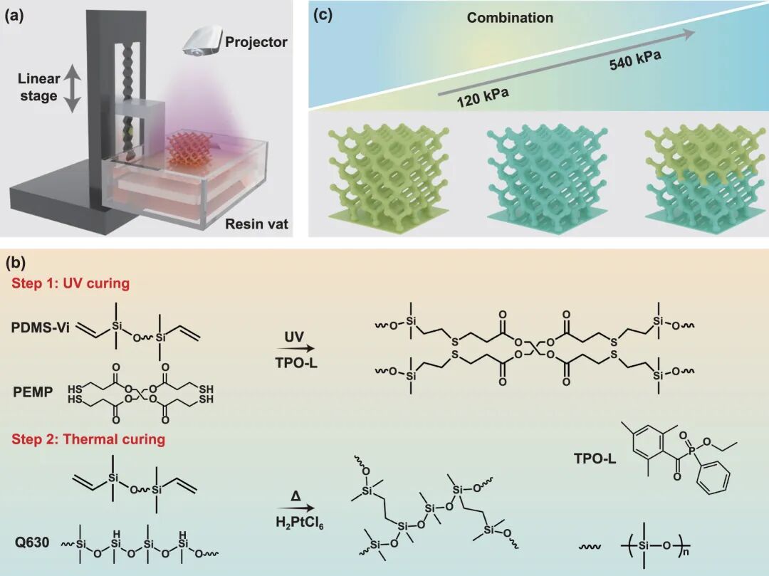 SR中有限的乙烯基含量嚴重限制了VP 工藝中的UV固化速度,另外SR彈性體固有的柔軟性使打印樣品柔軟而有彈性,使其容易變形且難以原型設計。為了應對這些挑戰,科研團隊采用了自上而下的基于DLP的3D打印機,利用多硫醇單體PEMP來促進快速的UV固化過程,如圖1(a)所示。巰基-烯點擊反應用于經過PEMP的巰基紫外線固化和 PDMS-Vi的雙鍵進行快速原型設計(圖 1(b),過程 1)。隨后,二次熱交聯導致 SR 前驅體充分聚合,從而改善3D打印物體的機械性能(圖 1(b),過程 2)。值得重視的是,經過交替運用擁有區別稀釋劑含量的油墨,能夠制備在垂直方向上擁有區別模量的繁雜3D 打印部件,例如模量范圍為120至540 kPa的任意組合(圖 1(c))。