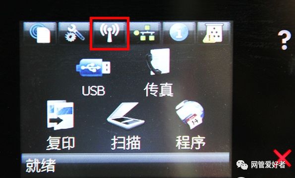 首要,咱們先來進(jìn)行普通的無(wú)線連接。在支持無(wú)線打印的打印機(jī)操作面板(屏幕或屏幕周邊)會(huì)有下面紅框內(nèi)的標(biāo)識(shí),點(diǎn)擊此無(wú)線標(biāo)識(shí)就能夠進(jìn)行對(duì)打印機(jī)無(wú)線功能的設(shè)置。