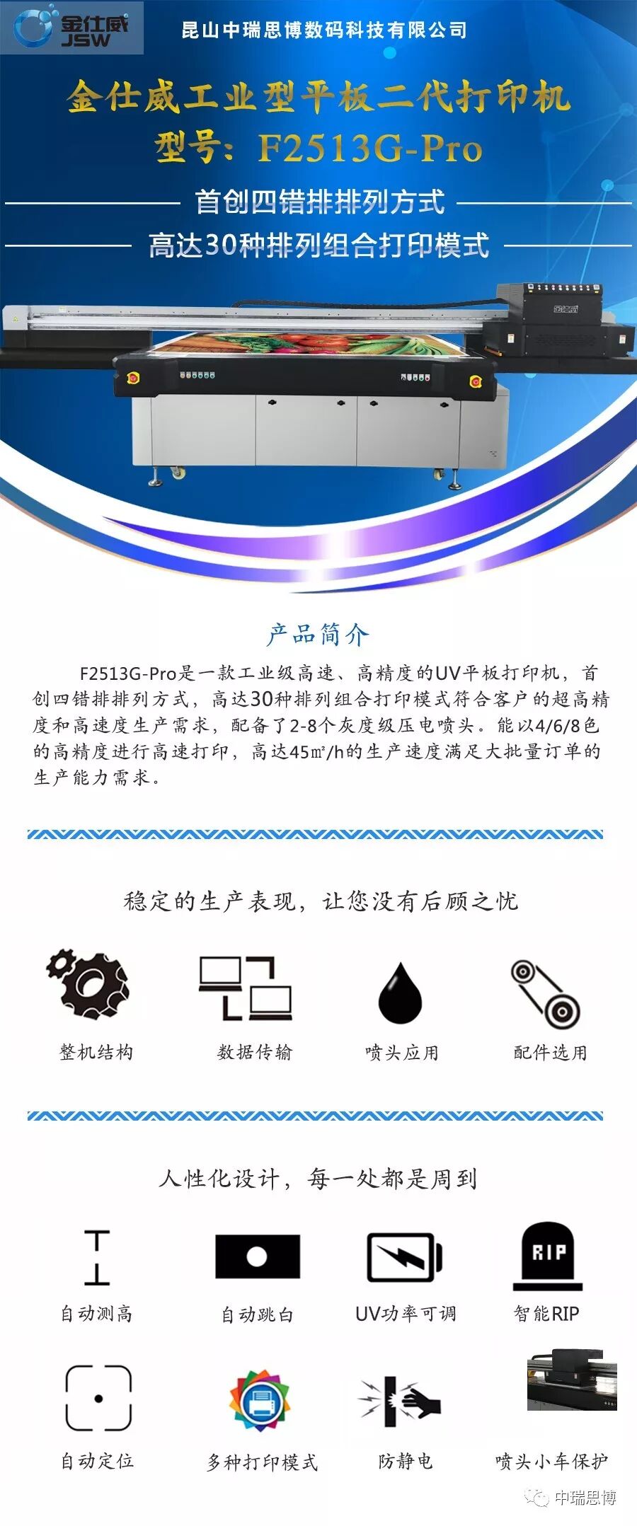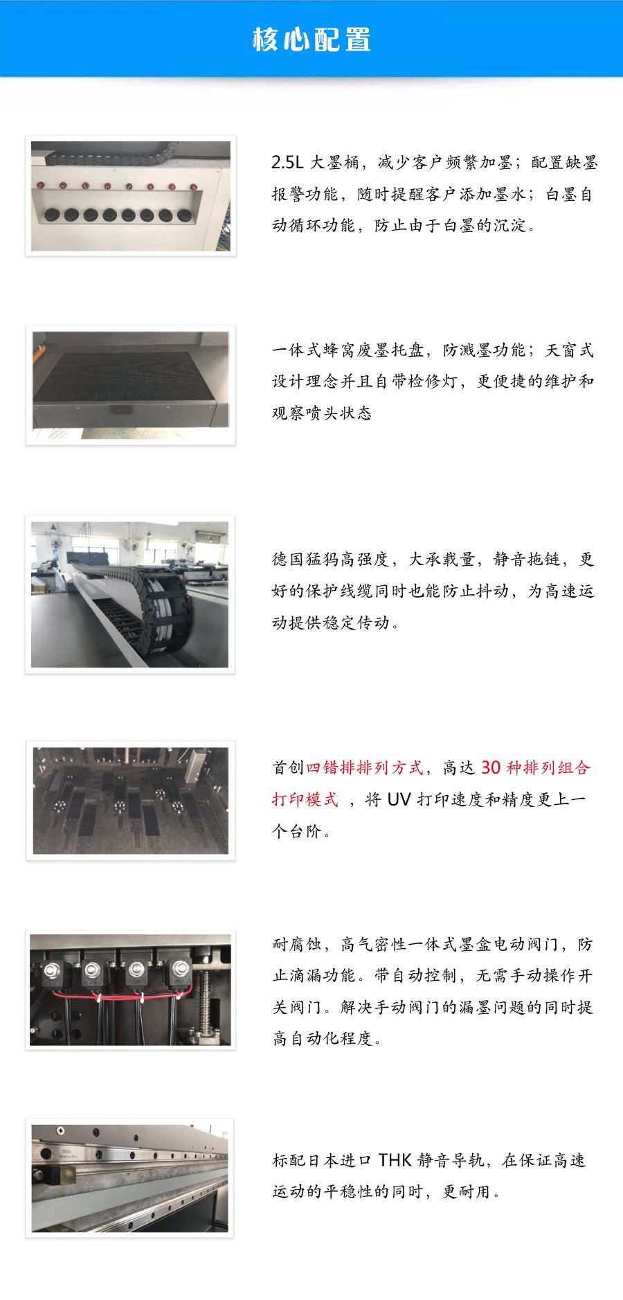 打印寬幅?2.5x1.25m噴頭型號(hào)?日本理光 G5 噴頭噴頭數(shù)量? 2-8 個(gè)打印厚度?10cm 厚UV 墨水?日本/美國(guó)顏色?標(biāo)牌CMYK,選配 Lc/Lm/W/V材料定位?自動(dòng)升降式定位安裝,快速擺放材料X軸大梁高強(qiáng)度模具一體成型鋁合金,精度保準(zhǔn)在 15 絲之內(nèi)皮帶意大利 HOYERA 同步帶導(dǎo)軌日本 THK 靜音導(dǎo)軌減速機(jī)臺(tái)灣 ZOYOY驅(qū)動(dòng)電機(jī)400W 臺(tái)達(dá) A 系列全功能伺服器及電機(jī)運(yùn)動(dòng)方式?行星減速機(jī)+伺服驅(qū)動(dòng)Y軸皮帶意大利 HOYERA 同步帶導(dǎo)軌韓國(guó) WON 靜音導(dǎo)軌絲桿臺(tái)灣 GTEN驅(qū)動(dòng)電機(jī)750W 臺(tái)達(dá) A 系列全功能伺服器及電機(jī)運(yùn)動(dòng)方式雙導(dǎo)軌+雙絲桿+750W 伺服驅(qū)動(dòng)Z軸導(dǎo)軌臺(tái)灣上銀靜音導(dǎo)軌驅(qū)動(dòng)器研控驅(qū)動(dòng)電機(jī)運(yùn)動(dòng)方式?雙導(dǎo)軌+臺(tái)灣 GTEN 絲桿+驅(qū)動(dòng)電機(jī)電源?臺(tái)灣明緯 MW電器件空氣開關(guān)正泰按鈕開關(guān)紅波按鈕限位開關(guān)日本歐姆龍柔性電纜德柔機(jī)械材料最大承重?150公斤分色壓墨?只需按一個(gè)按鈕,就能夠實(shí)現(xiàn)某個(gè)顏色或所有顏色噴頭的壓墨掌控,從而使設(shè)備的守護(hù)和清洗變得更加簡(jiǎn)單。升降功能?墨車升降,電子自動(dòng)/手動(dòng)智能感應(yīng)檢測(cè)調(diào)節(jié)高度LED燈珠?韓國(guó) LG拖鏈?德國(guó)猛犸負(fù)壓掌控?雙負(fù)壓掌控集成板卡,4 負(fù)壓表(臺(tái)達(dá))RIP 系統(tǒng)?標(biāo)配美國(guó) Photoprint 12 版本/荷蘭 GMG-V6 版本,選配美國(guó) ONYX12一級(jí)墨桶 ?2.5L 大墨桶,缺墨報(bào)警功能,白墨自動(dòng)循環(huán)功能二級(jí)墨盒?溢墨守護(hù)功能。帶加熱功能,電動(dòng)閥門,防止滴漏。自動(dòng)掌控,無(wú)需手動(dòng)操作開關(guān)閥門。測(cè)高安裝?自動(dòng)測(cè)高探頭除靜電?標(biāo)配 2 套除靜電系統(tǒng)。信號(hào)傳輸 ?雙光纖信號(hào)傳輸+SATA 線高速信號(hào)線;所有信號(hào)傳輸增多磁環(huán),防止干擾。外設(shè)?設(shè)備自帶 4 個(gè) USB 口接頭;外設(shè)大梁前后移動(dòng)開關(guān),方便板材上料。應(yīng)急功能?防撞激發(fā)續(xù)打印功能,斷電續(xù)打印功能迎關(guān)注昆山中瑞思博