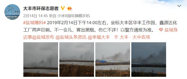 2月14日情人節(jié),人們還沉溺在節(jié)日的喜悅氛圍里,下午14:00上下,博客名為@大豐市環(huán)保志愿者(大豐市環(huán)保局海洋分局、化工廢氣群眾監(jiān)督員)爆料叫作:鹽城市大豐區(qū)華豐工作園突發(fā)兩聲巨響,鑫源達(dá)化工廠冒出黑煙。