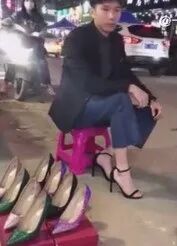 街頭擺地攤賣高跟鞋的小伙,坐在凳子上展示腳上這雙涼鞋,不顧及周邊人的異樣眼光。